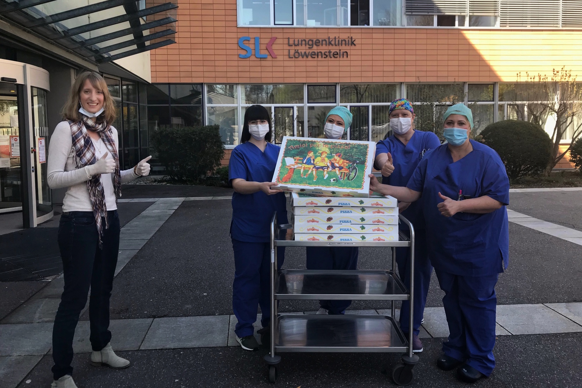 „Nachdem ich bereits letzte Woche eine Lieferung an selbstgenähten Behelfsmasken an die Heime der „Dienste für Menschen“ ausliefern konnte, war es mir sehr wichtig, den Beschäftigten in den Kliniken als weitere Alltagshelden symbolisch zu danken. In den Kliniken sorgen unzählige Ärztinnen und Ärzte, Pflegerinnen und Pfleger und viele weitere Beschäftigte dafür, dass die Kranken, insbesondere die mit dem Corona-Virus Infizierten, bestmöglich versorgt werden. Dabei retten sie nicht nur viele Leben, sondern stellen sich selbst hintenan und sind seit Wochen unermüdlich im Einsatz für die Patientinnen und Patienten“, so die CDU-Landtagsabgeordnete Isabell Huber nachdem sie am Donnerstag (2.4.) eine Lieferung Pizza als Mittagessen für die Intensivstation in der Lungenfachklinik Löwenstein vorbeigebracht hatte.