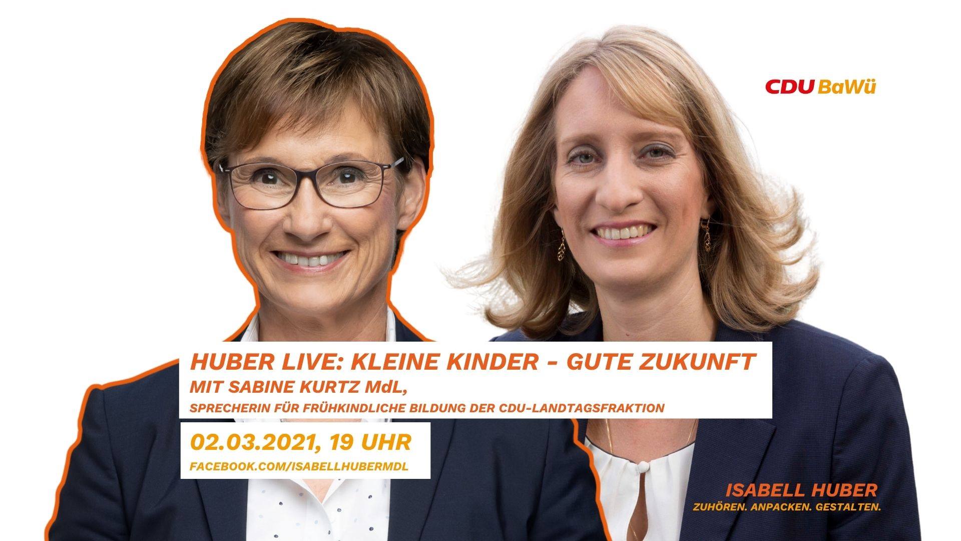 Mit Sabine Kurtz, MdL, Vizepräsidentin des Landtags von Baden-Württemberg, Sprecherin für frühkindliche Bildung und Kirchenpolitik spricht Isabell Huber MdL am 2. März 2021 ab 19 Uhr in einem Facebook-Live über...
