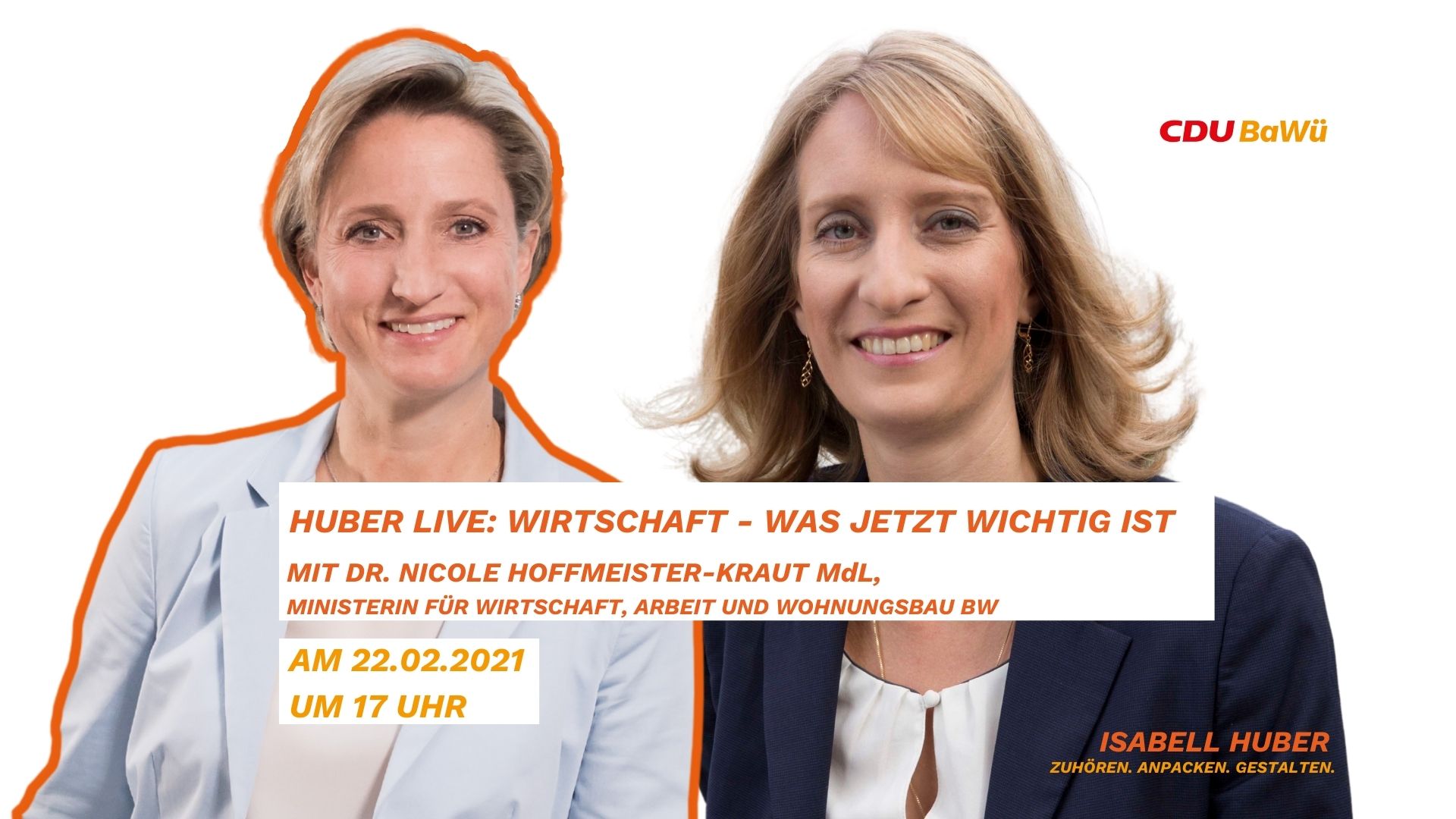 Wirtschaftsministerin Dr. Nicole Hoffmeister-Kraut MdL zu Gast bei Isabell Huber MdL Huber live: Wirtschaft - Was jetzt wichtig ist! am 22. Februar um 17 Uhr. Die Corona-Pandemie stellt unsere Wirtschaft vor enorme Herausforderungen....