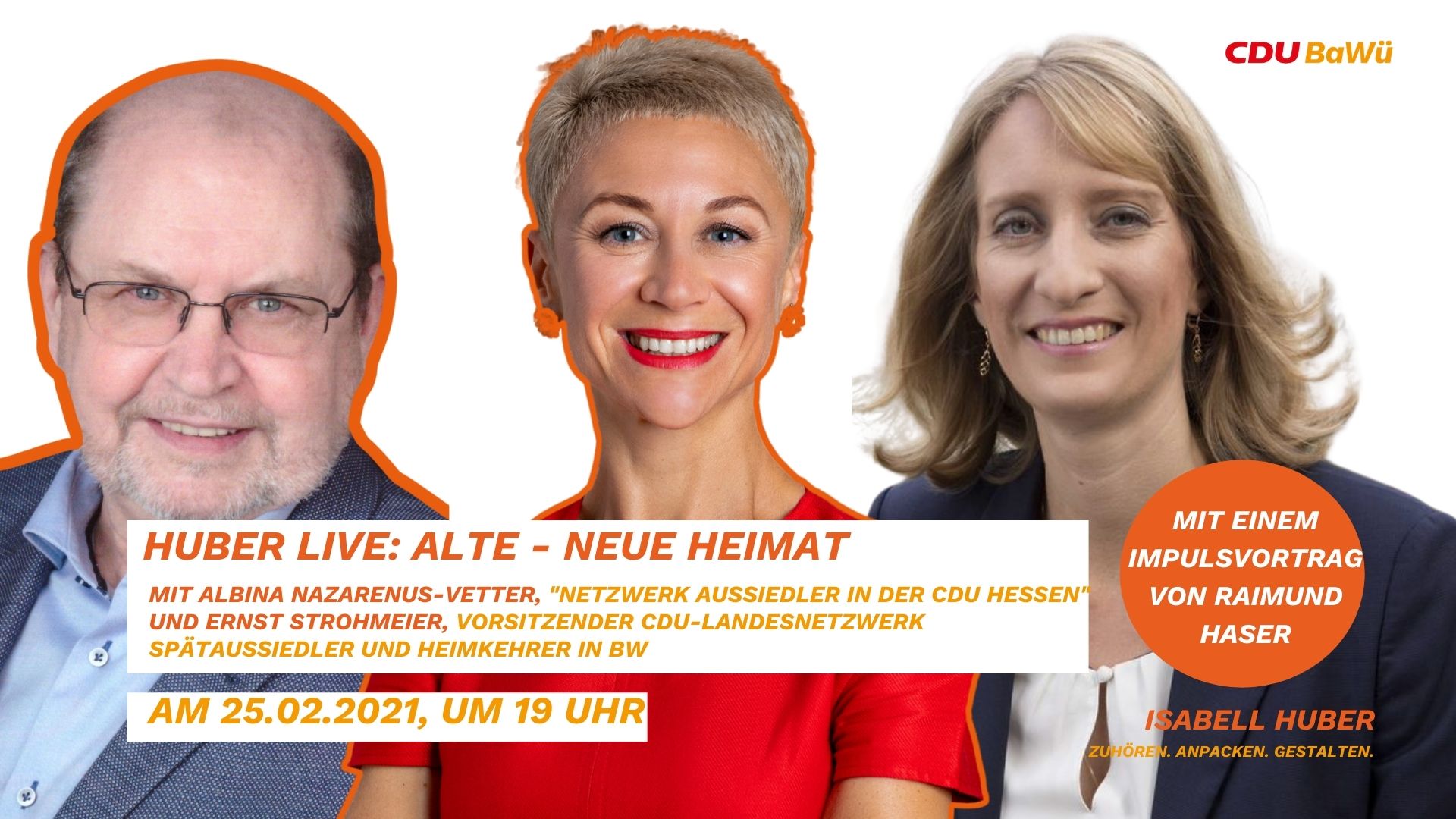 CDU-Kreisgeschäftsstelle HeilbronnIsabell Huber MdL lädt zu einer Online-Gesprächsrunde mit Albina Nazarenus-Vetter vom "Netzwerk Aussiedler in der CDU Hessen" (UdV) und Ernst Strohmaier, Vorsitzender des CDU-Landesnetzwerkes Spätaussiedler und Heimkehrer in Baden-Württemberg ein....