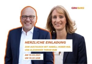 Alexander Throm MdB und ich laden Sie herzlich zu einem Austausch per Videokonferenz ein. Wir wollen mit Ihnen - über aktuelle Themen, Ihre Anliegen und Wünsche an die Politik sprechen, ortsbezogen und direkt: Am 9. Februar 2021, 19:30...